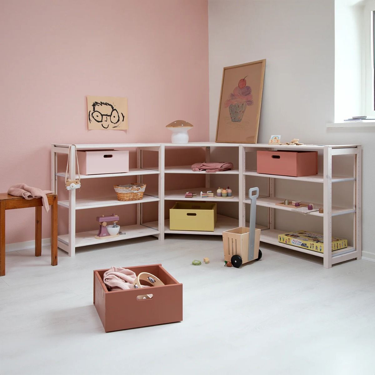 Træt af rod i hjørnerne? Med Dybdal hjørnereol får du en smuk og praktisk opbevaringsløsning, der er skabt til børnefamilier. Reolen er perfekt til dig, der ønsker mere orden i børneværelset eller multirummet – uden at gå på kompromis med stilen.