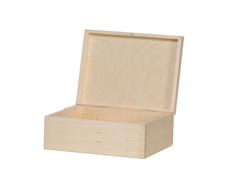 B21 L14 H10 cm. Smart æske i ubehandlet finér til opbevaring. Låget kan slås op.