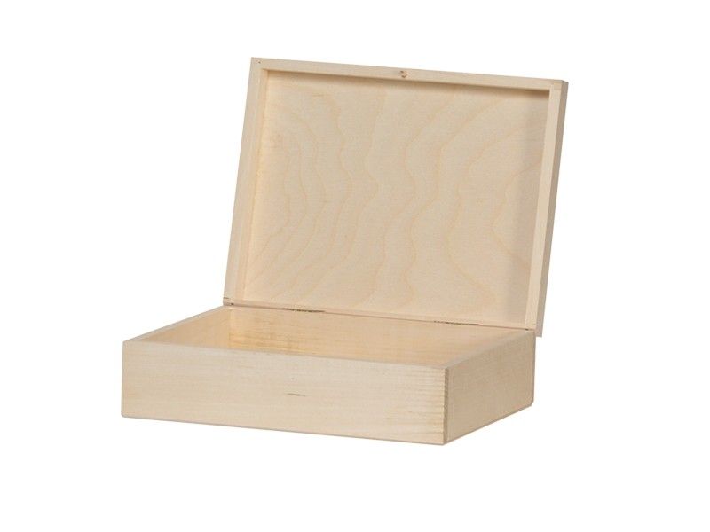B27 L20 H8,3 cm. Smart æske i ubehandlet finér til opbevaring. Låget kan slås op.