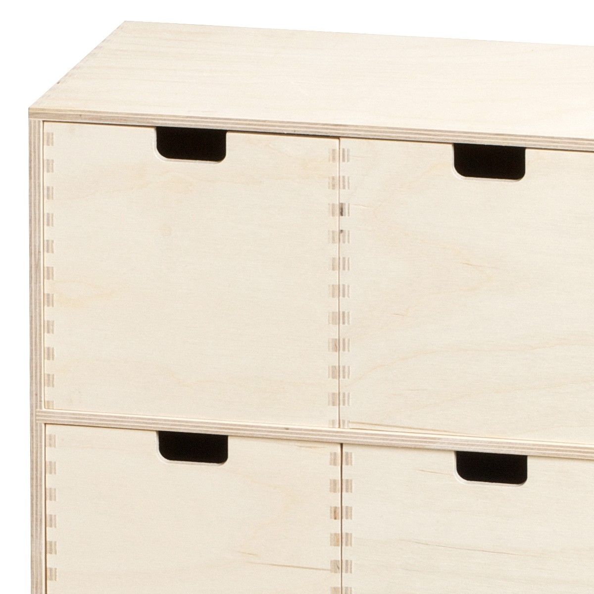 B34 H72 D20 cm. Smart kasse med 8 opbevaringsrum i ubehandlet birkekrydsfinér. Hver skuffes indvendige mål er B15 H16 L17,5 cm.