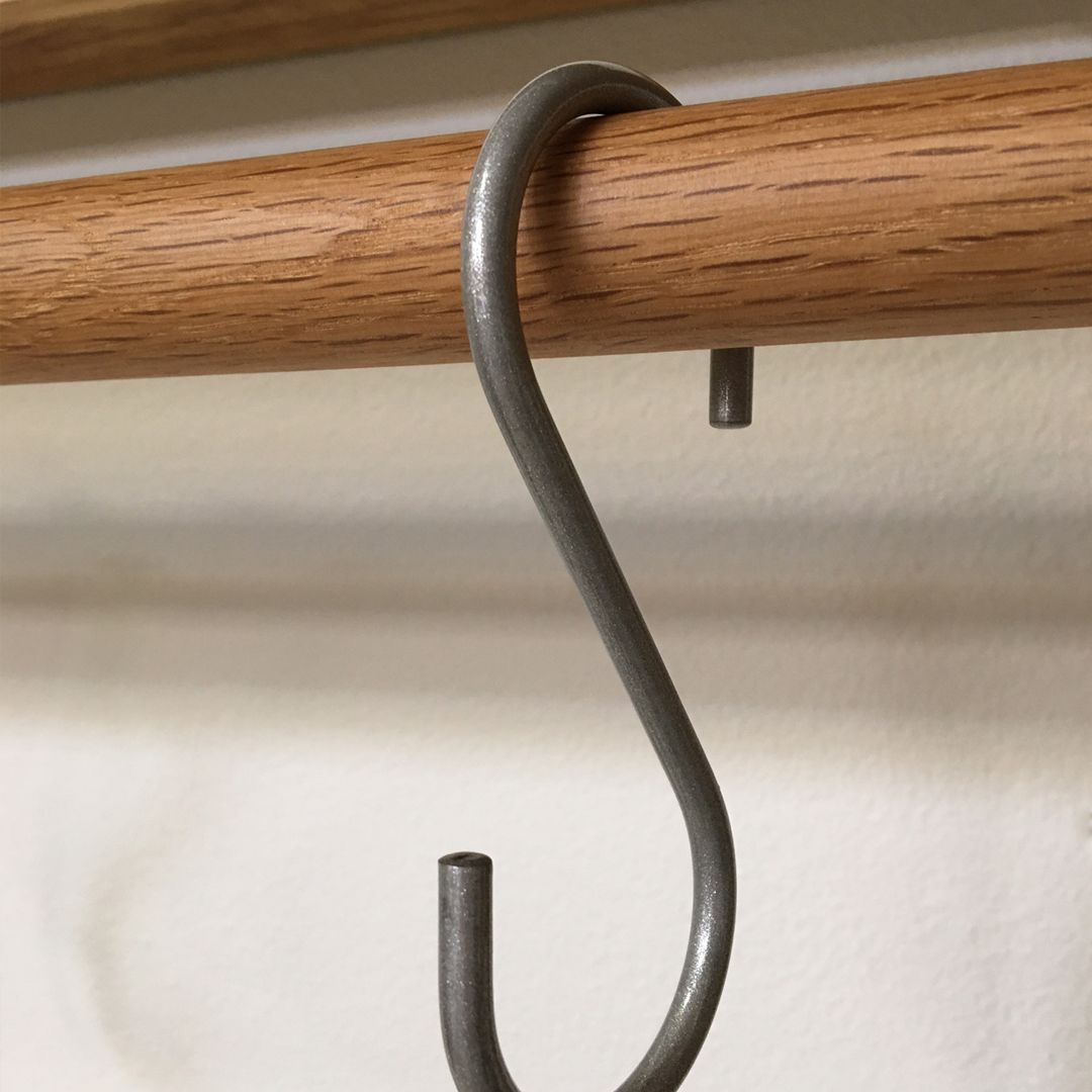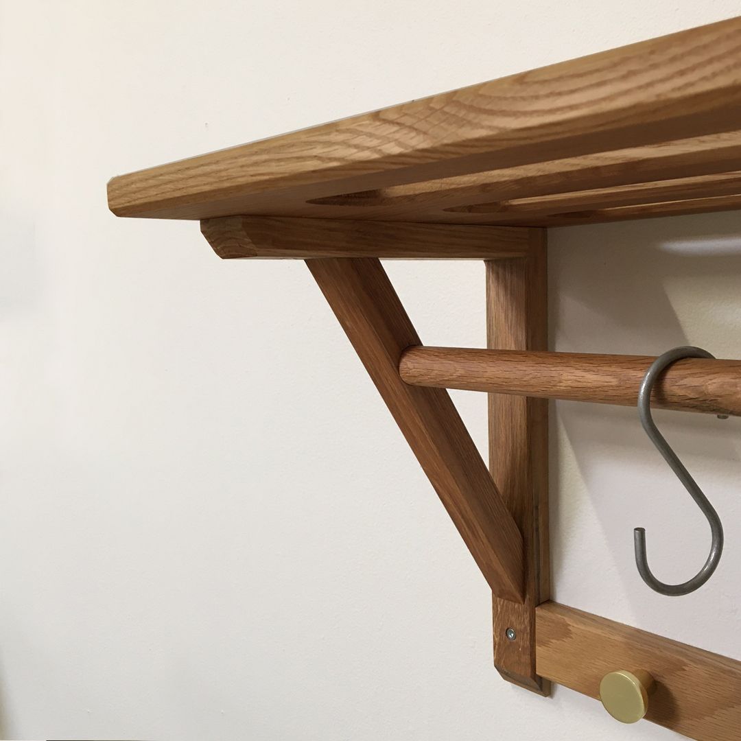Flot hattehylde i naturolieret massiv eg. Designet er enkelt og smukt. Passer perfekt ind i entreen. Der medfølger 4 s-kroge i mat stål og 5 knager i børstet metal.