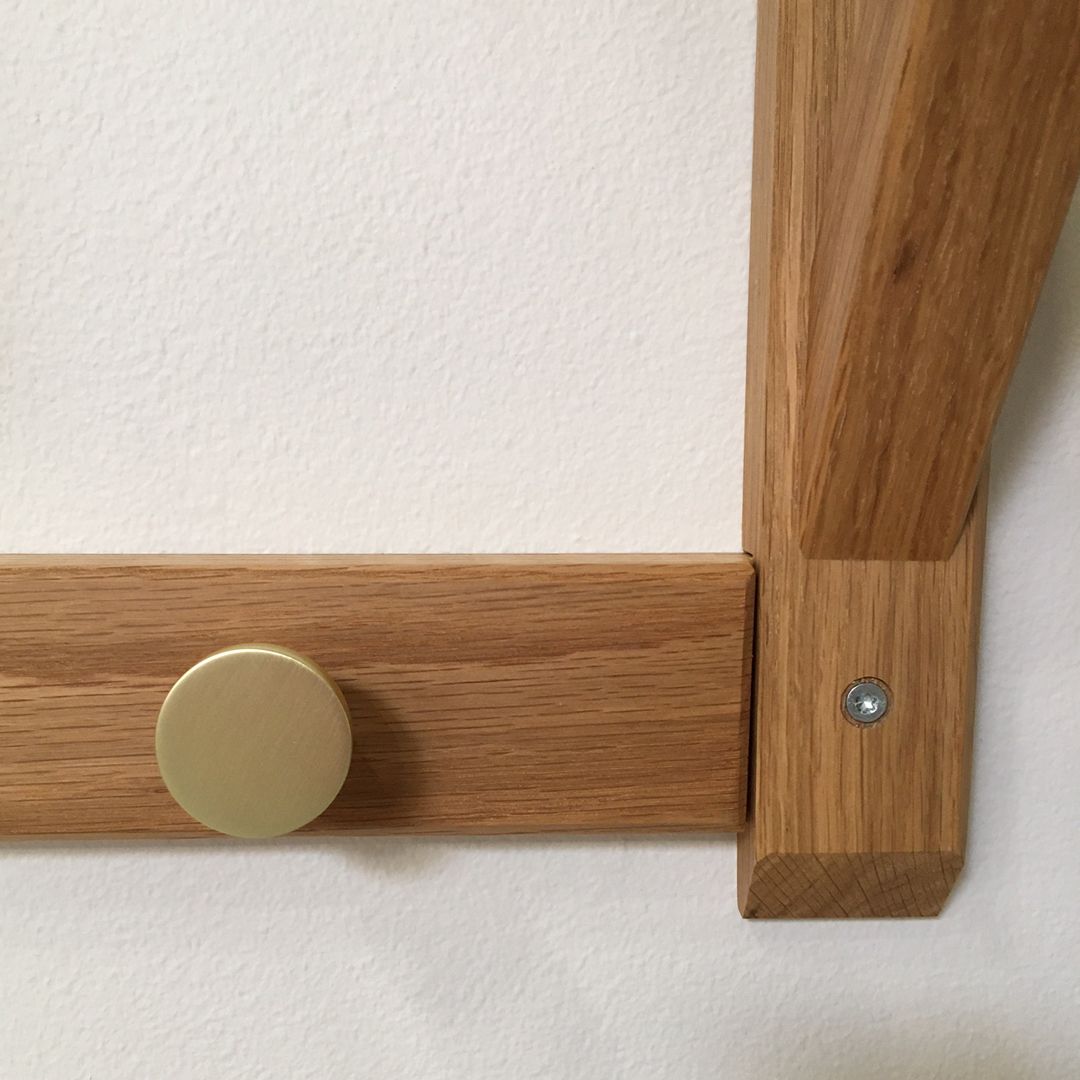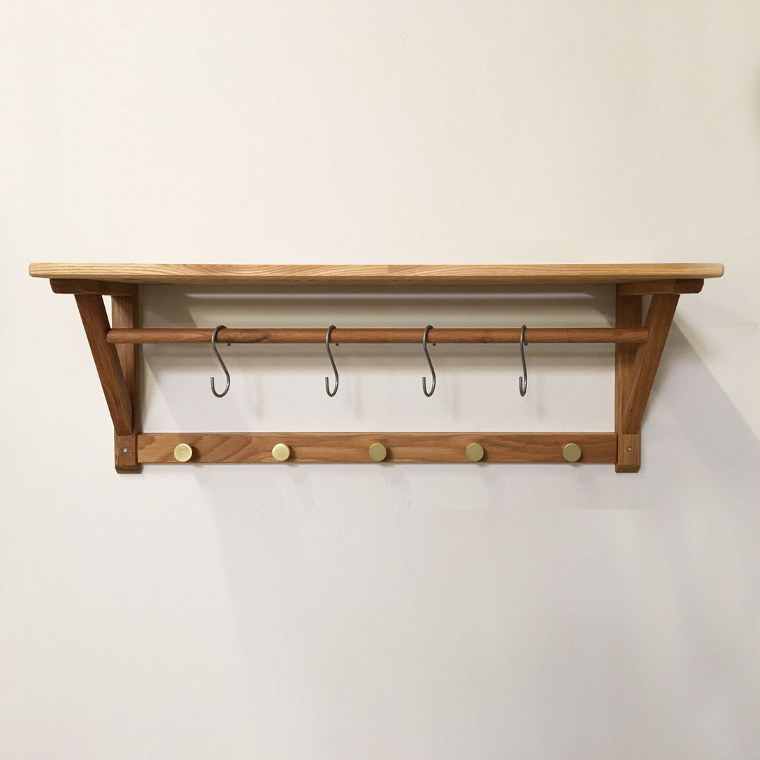 Flot hattehylde i naturolieret massivt eg. Designet er enkelt og smukt. Passer perfekt ind i entreen. Der medfølger 4 s-kroge i mat stål og 5 knager i messing-look.