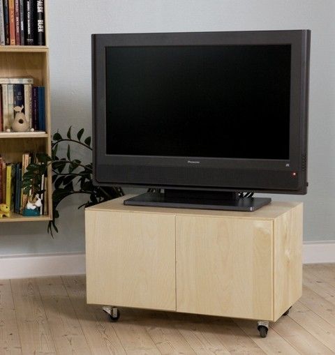 Tv/videovogn i birkekrydsfiner med hjul, består af KUBIK reol nr. 6416, hjul, gennemgående hylde og to låger. Der er mulighed for at lave hul i bagbeklædning til kabler.