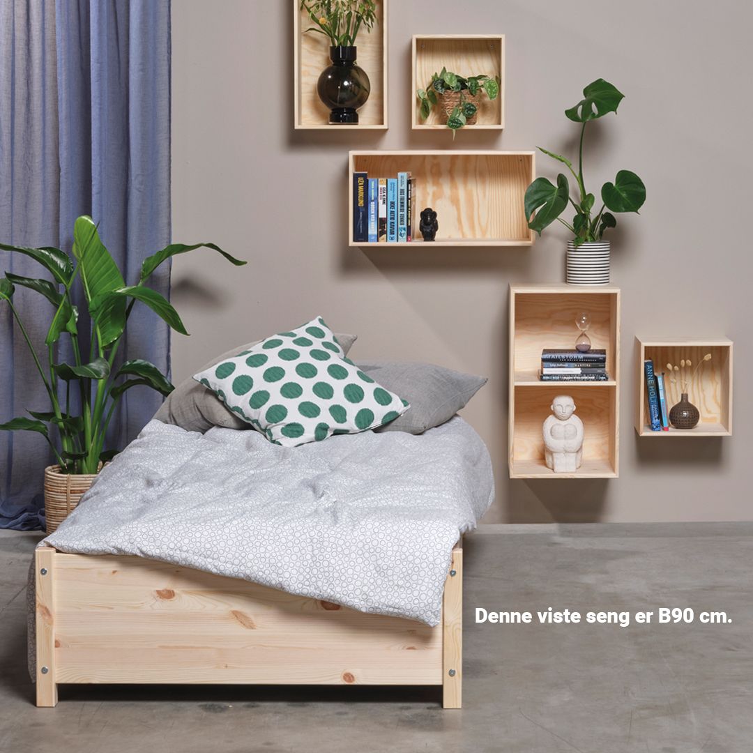 B120 L200 cm. (madrasmål) Læg 7 cm. til bredde og længde og du har sengens udvendige mål. Sengeramme i massiv fyr med luft til gulvet, der ventilerer madrassen.