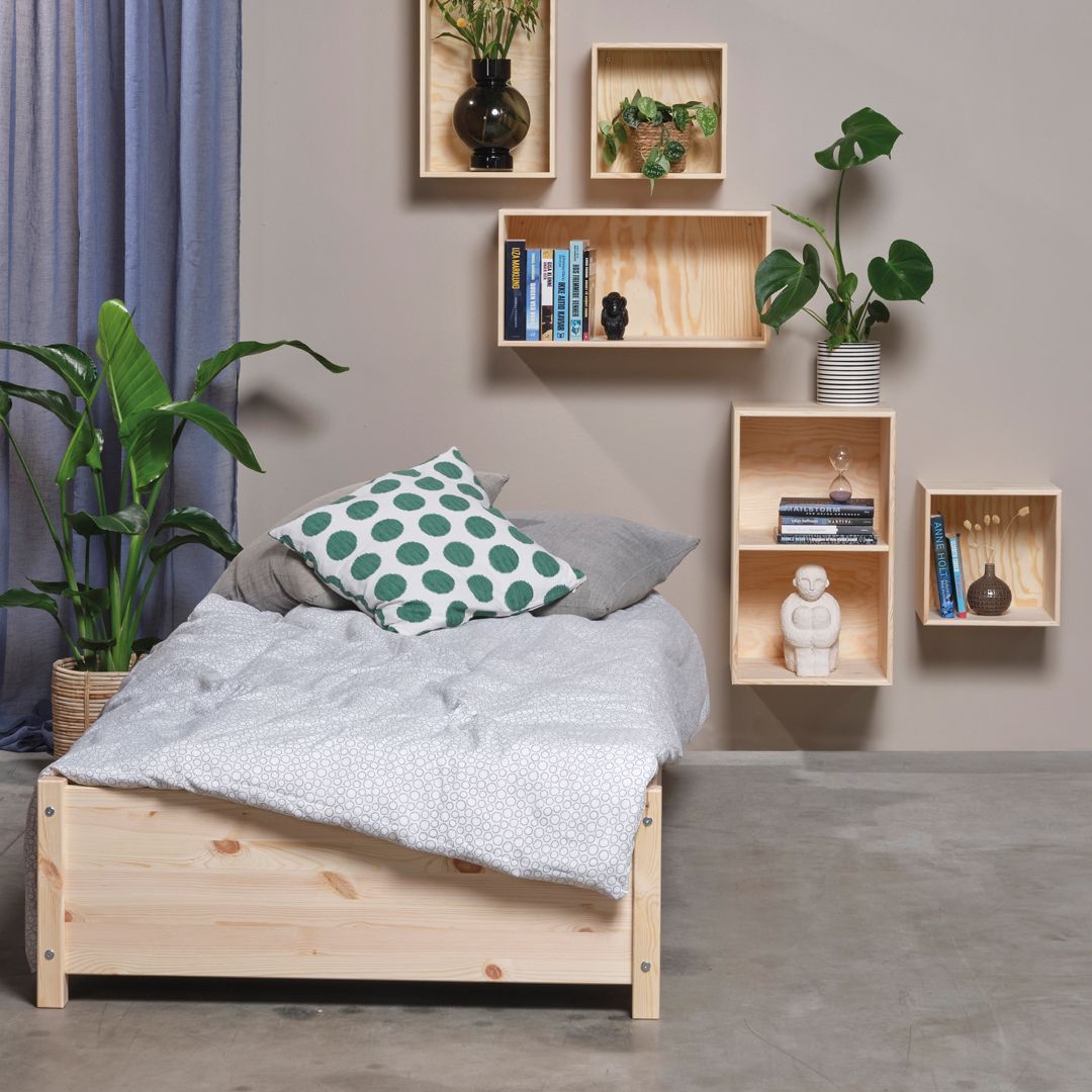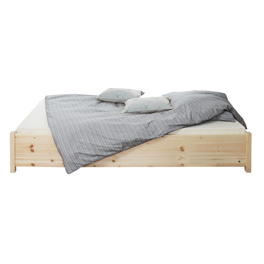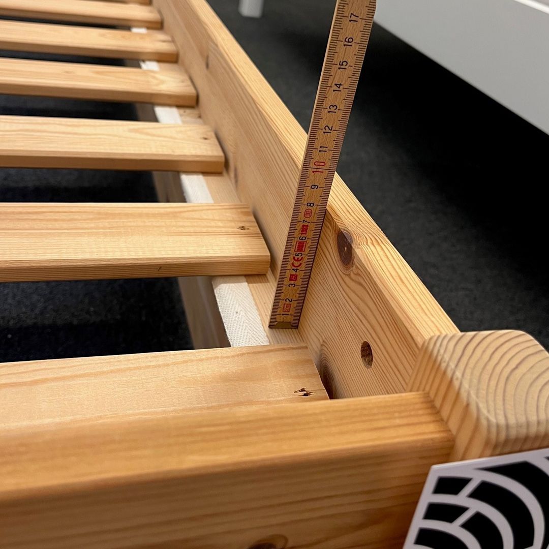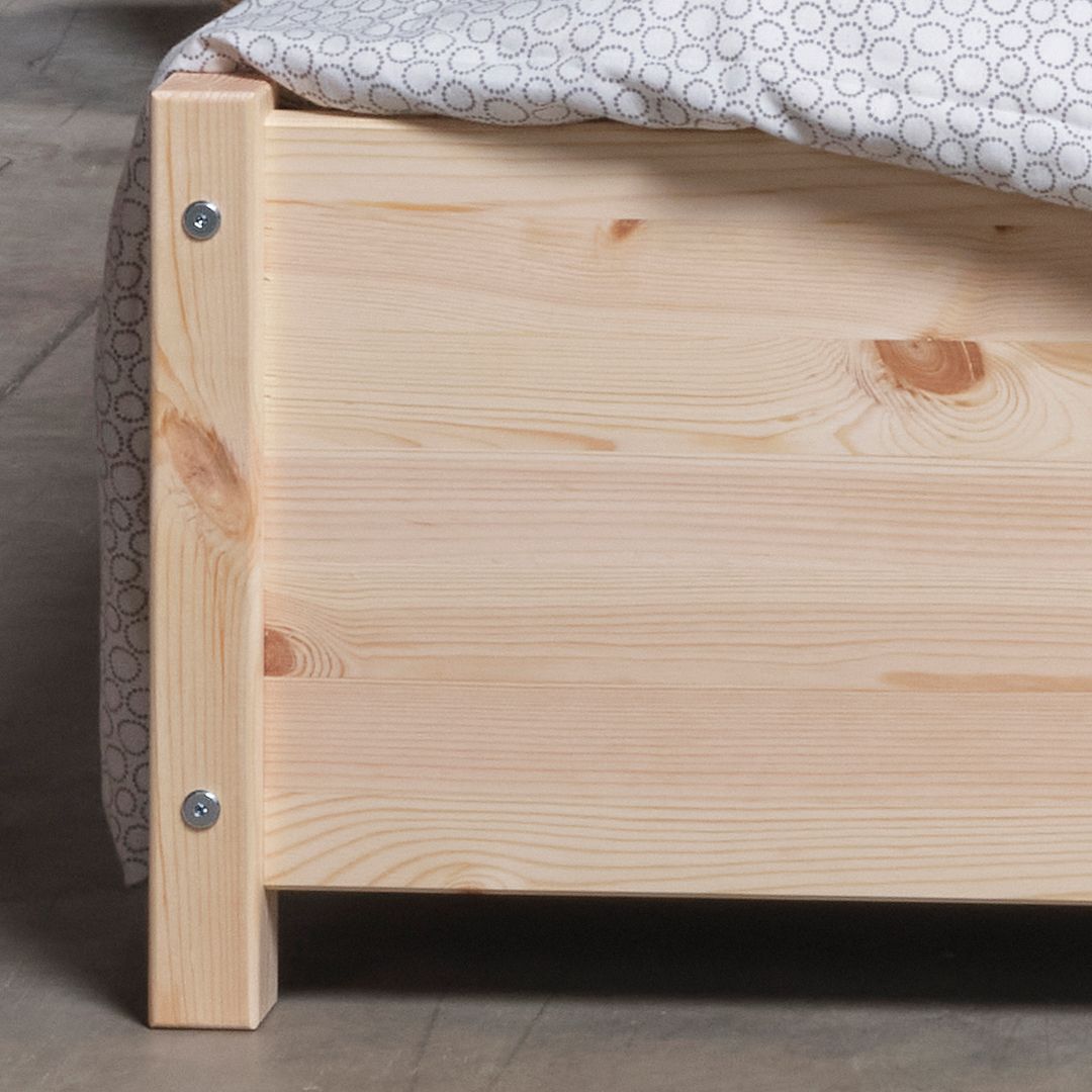 B90 L200 cm. (madrasmål) Læg 7 cm. til bredde og længde og du har sengens udvendige mål. Sengeramme i massiv fyr med luft til gulvet, der ventilerer madrassen.