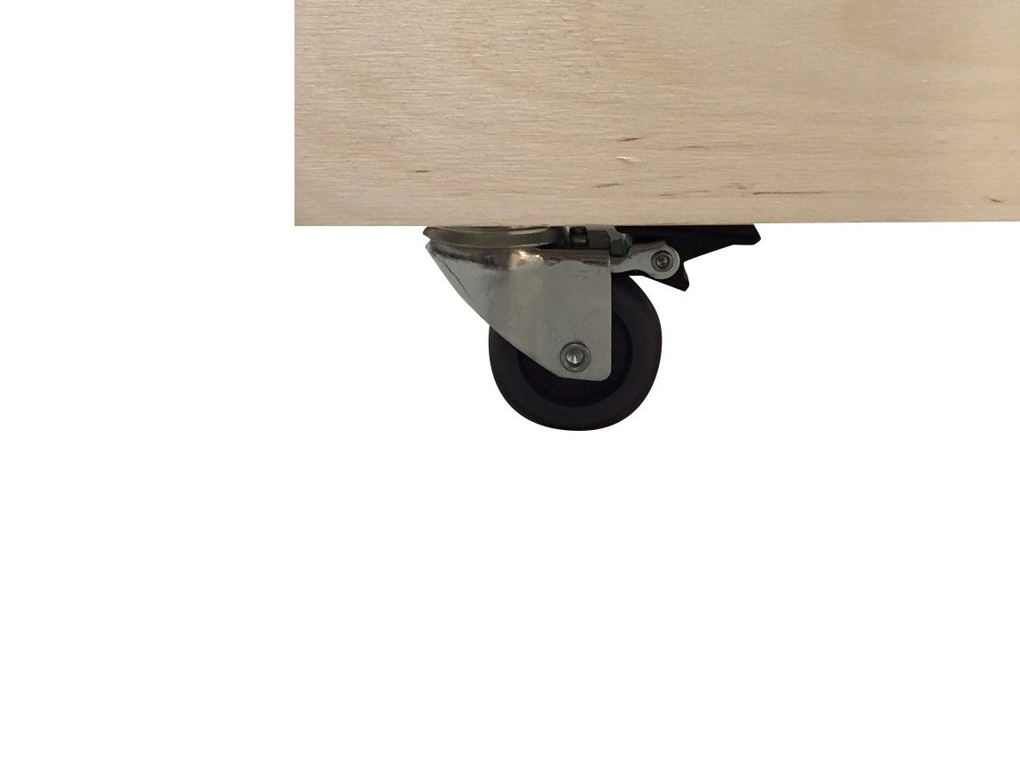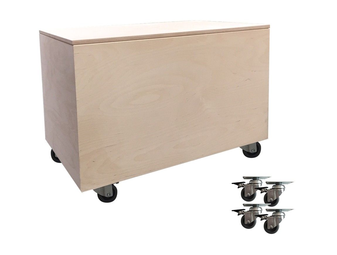 B38 L58 H45 cm. Flot og enkel legetøjskasse i ubehandlet birkekrydsfinér. Inkluderet i prisen er 4 stk. grå gummihjul med bremse, som kan monteres, hvis man ønsker det. Kassen kan også bruges uden hjul. Til kassen hører et aftageligt låg.