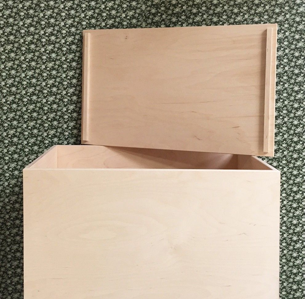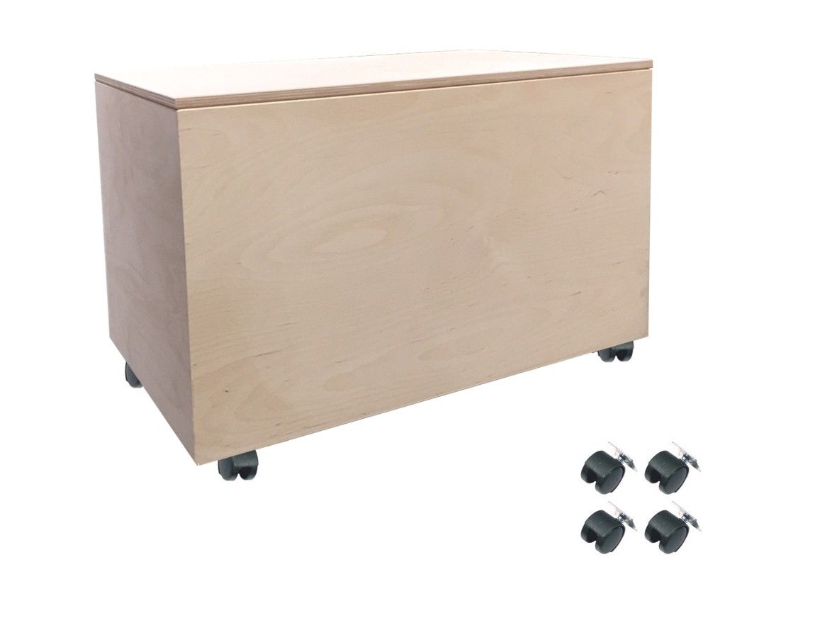 B38 L58 H44 cm. Flot og enkel legetøjskasse i ubehandlet birkekrydsfinér. Inkluderet i prisen er 4 stk. sorte plastikhjul, som kan monteres, hvis man ønsker det. Kassen kan også bruges uden hjul. Til kassen hører et aftageligt låg.