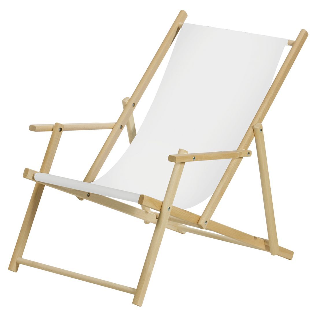 Klassisk liggestol med armlæn i ubehandlet massiv bøg med stof i råhvid. Stolen har tre mulige liggeindstillinger. Udover denne farve fås den også i hvid/rød, hvid/blå og hvid/grøn stribet. Liggestolen er nem at opbevare, da den kan klappes sammen så den ikke fylder. Stolen leveres ubehandlet og samlet, men kan med fordel behandles med lak, olie eller træbeskyttelse for at forlænge dens levetid. Bruger du den udendørs, bør du tage den ind om natten eller i dårligt/fugtigt vejr. Ubehandlet træ 'arbejder' og der er en risiko for, at træet udvider sig, når det står fugtigt. Cirka-mål i udslået tilstand: Længde 110 cm. Bredde 61 cm. Højde 80 cm.