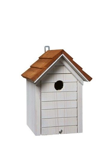 L19 D19 H25/28 cm. Musvitkasse i hvidbejdset fyr med brunbejdset skråt A-tag. 32 mm hulstørrelse.