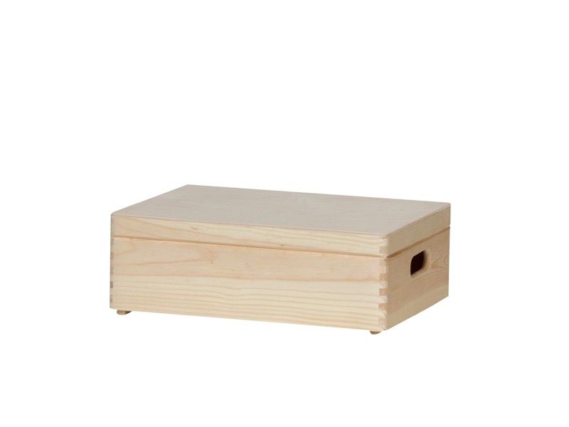 B40 L30 H14 cm. Smart kasse i ubehandlet finér til opbevaring. Der er hul i begge ender af skrinet (håndtag). Låget kan slås op. Hos Trævarefabrikernes Udsalg finder du mange varianter af skrinet - du finder også æsker og kister. (kan variere med +/- 5 mm fra sending til sending)