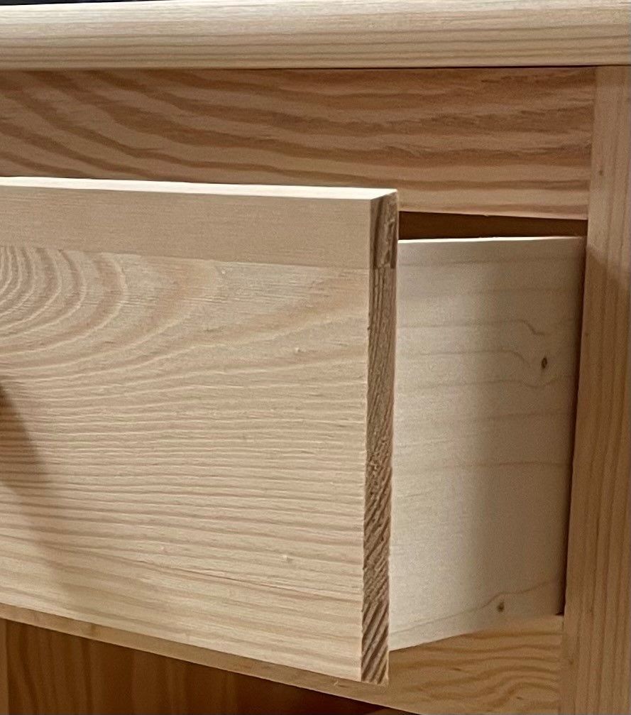 Materialer: hovedsageligt fremstillet i massiv fyr, sider og skuffebunde er fremstillet i krydsfiner.