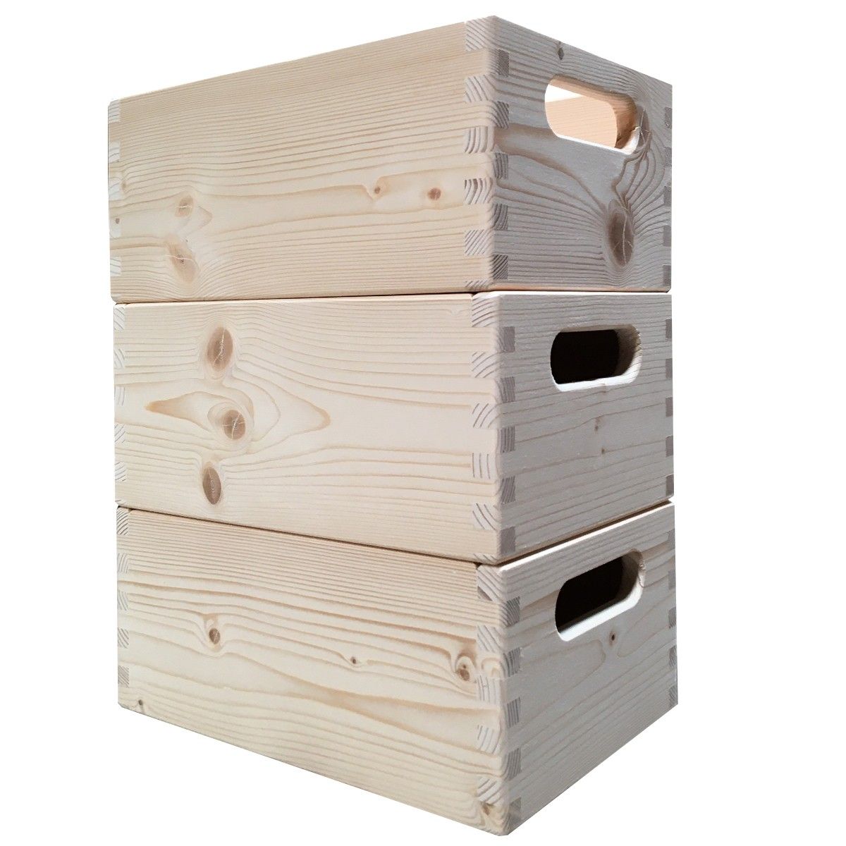 Stabelkassen fremstillet i massiv ubehandlet gran med stærk notmonteret 4 mm krydsfinerbund. Under hver kasse er der 4 fødder, der gør det muligt at stable kasser i samme størrelse.