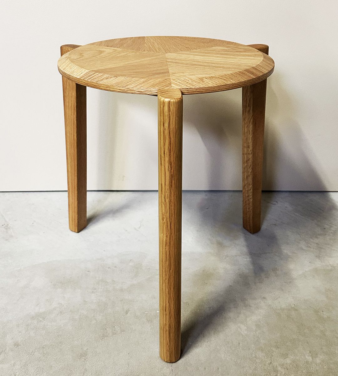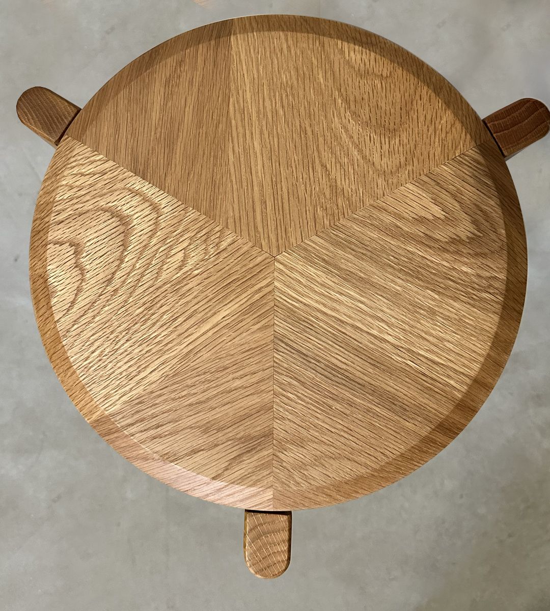 Taburetten har 3 ben og måler H45 cm. Sæde Ø32 cm. Benene stikker 4 cm. udenfor sædet.